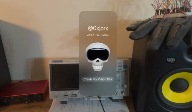 In the post, Ravichandran shared images of an app they created for Vision Pro that has a button labeled “Crash My Vision Pro” with a skull Emoji wearing a Vision Pro headset on it. When tapped, the Vision Pro crashes. When it comes back up, it does so in full pass-through mode and displays a message for the user that Vision Pro must reboot and that it will go dark after 30 seconds.